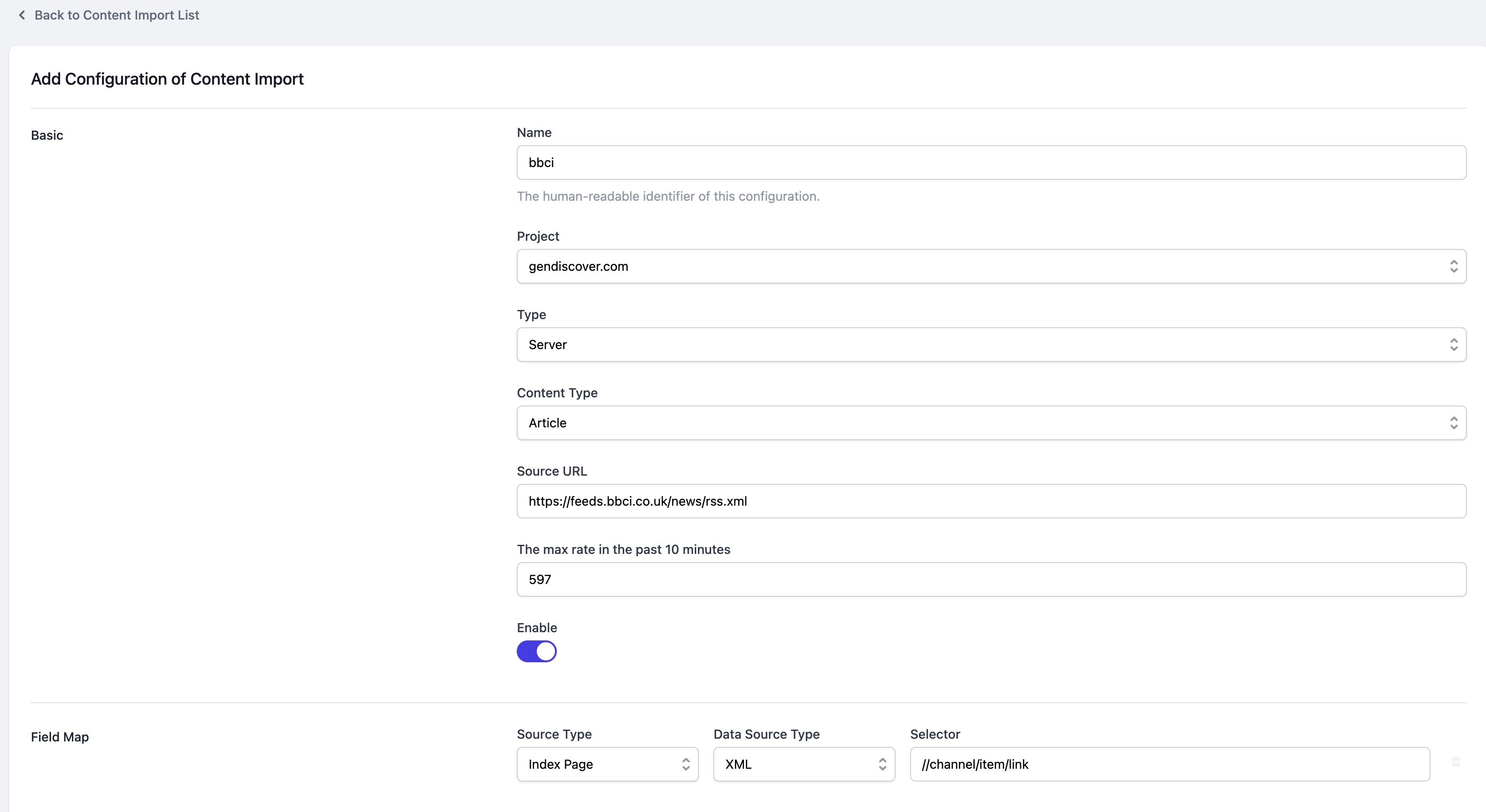 You will need to configure the entry URL for importing in the settings page, and then define how to obtain article links in the Field Map section. For a standard RSS feed, you can enter //channel/item/link in the Index Page field of Field Map to extract the article links.