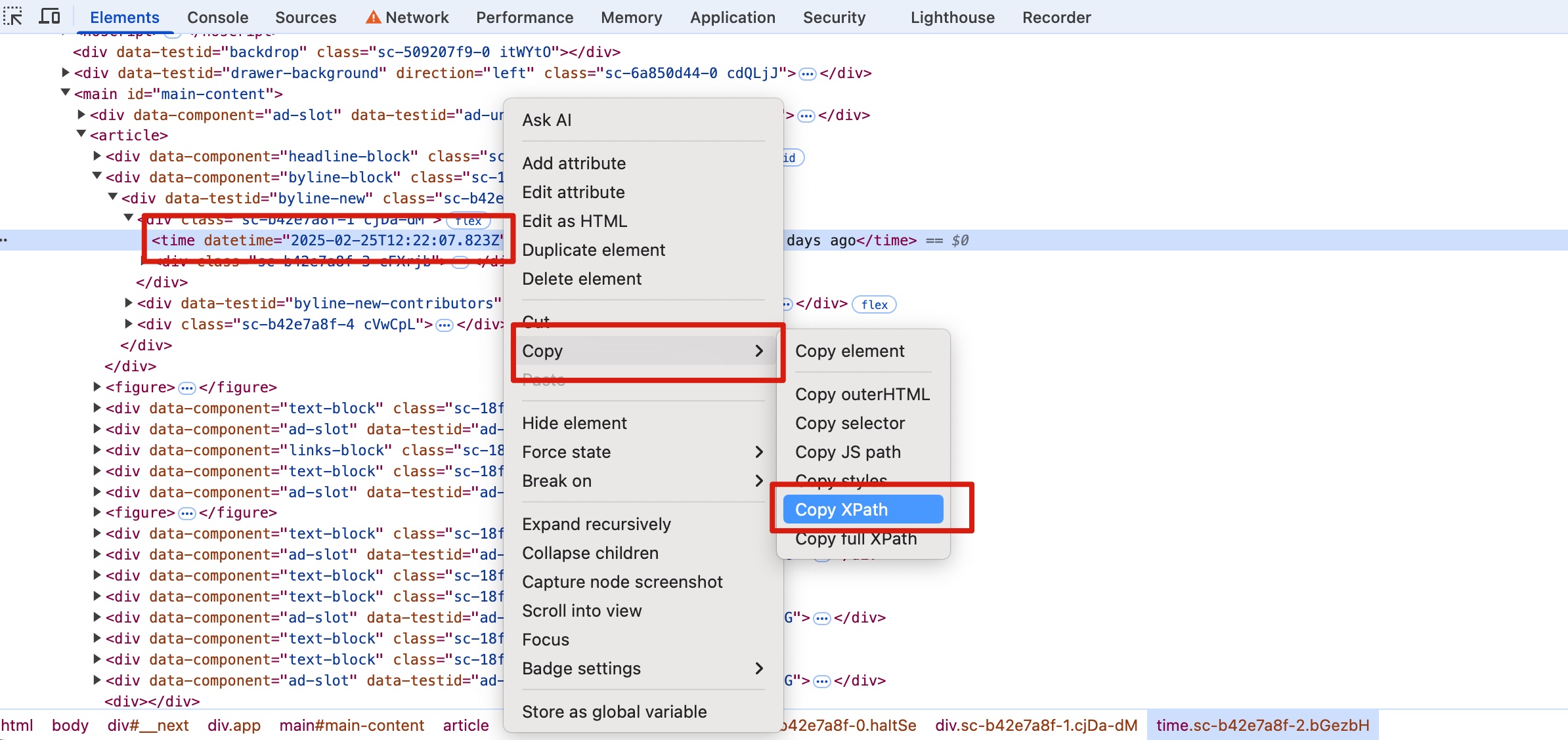 Next, click Copy -> Copy XPath to obtain the element's XPath.