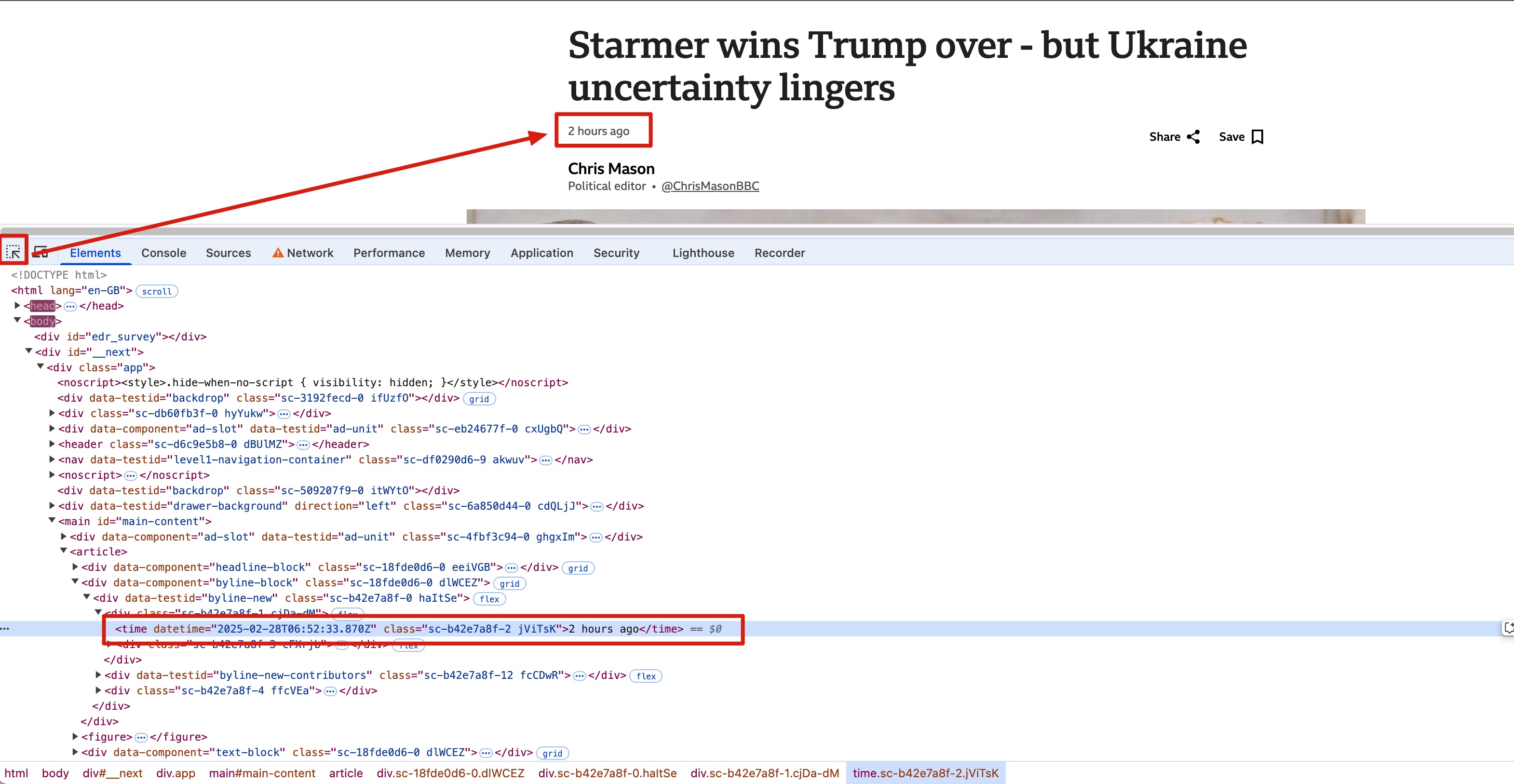 If you wish to extract a specific attribute of an element, you can add /@attribute_name to the XPath. For example, to retrieve the datetime attribute shown in the image above, append /@datetime to the XPath.